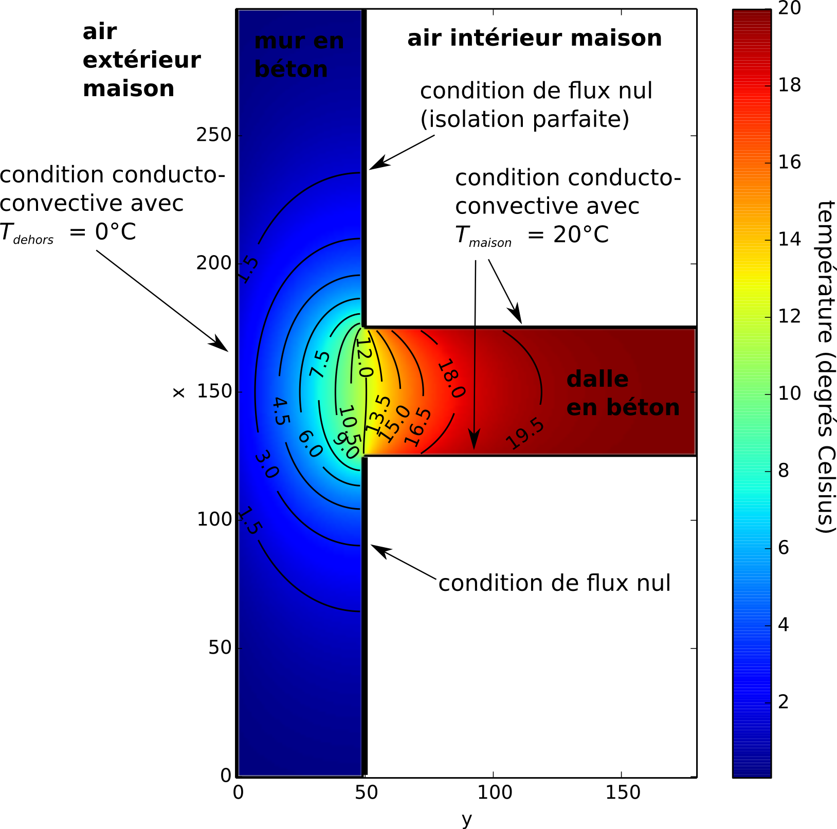 Aussi publié dans le BUP no 1013. Méthode de Jacobi et améliorations (Gauss-Seidel et surrelaxation), conditions aux bords de type Dirichlet, Neumann et conducto-convective, exemples (barreau calorifugé sur les côtés avec température ou flux fixé aux extrémités, ailette de refroidissement très fine, condensateur, étude de l’effet de pointe, ailette de refroidissement de dimensions quelconques, pont thermique).